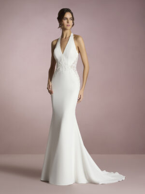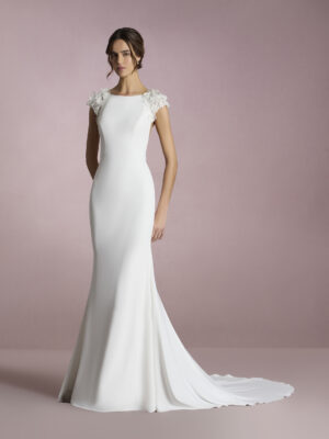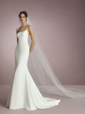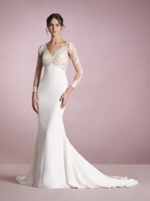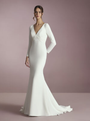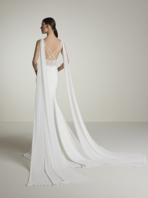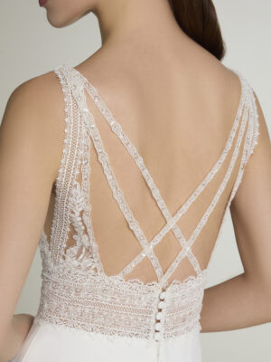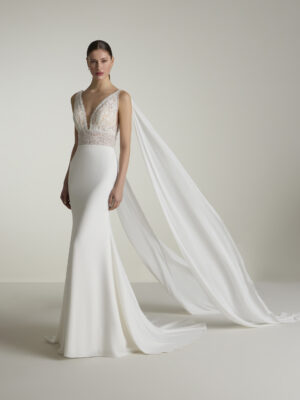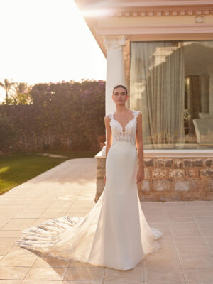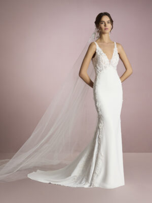 Vestido de novia sirena con escote de pico con tirantes y espalda cruzada en crepe