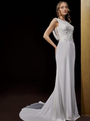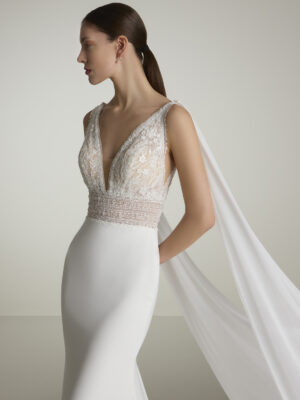 El vestido IKA destaca por su estilo sofisticado y sus románticos detalles. Este modelo de corte sirena se compone de un corpiño de encajes y pedrería con tirantes dobles que se cruzan en la espalda creando una maravillosa forma geométrica y de una falda de crepe que envuelve la figura y se abre desde la rodilla para crear un efecto muy favorecedor. Además, cuenta con colas desmontables que le añaden un toque aún más especial.